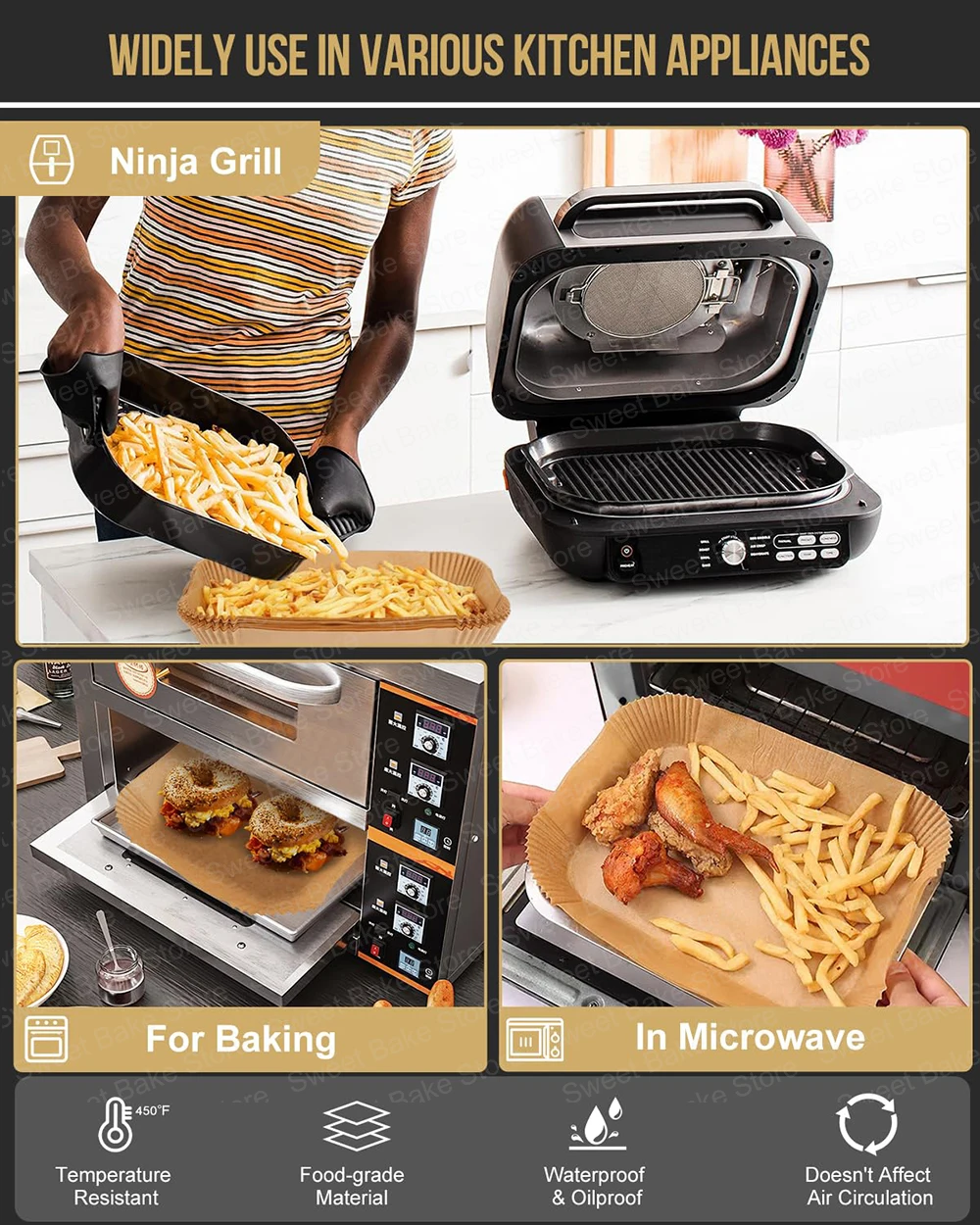 Fabriquées à partir de matériaux alimentaires, ces feuilles sont imperméables, résistantes à l’huile, antiadhésives et très résistantes à la chaleur. Elles supportent des températures allant jusqu’à 220 °C et absorbent une grande partie des graisses et résidus alimentaires pour une cuisson plus saine.