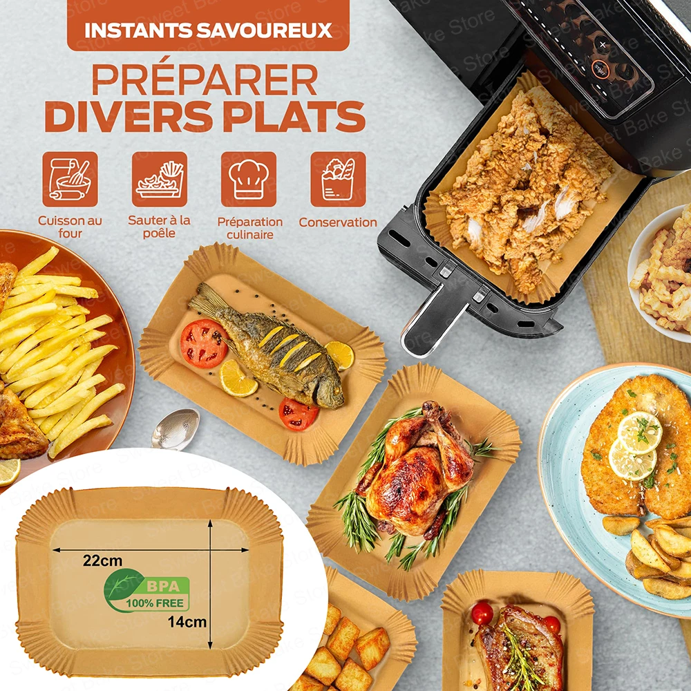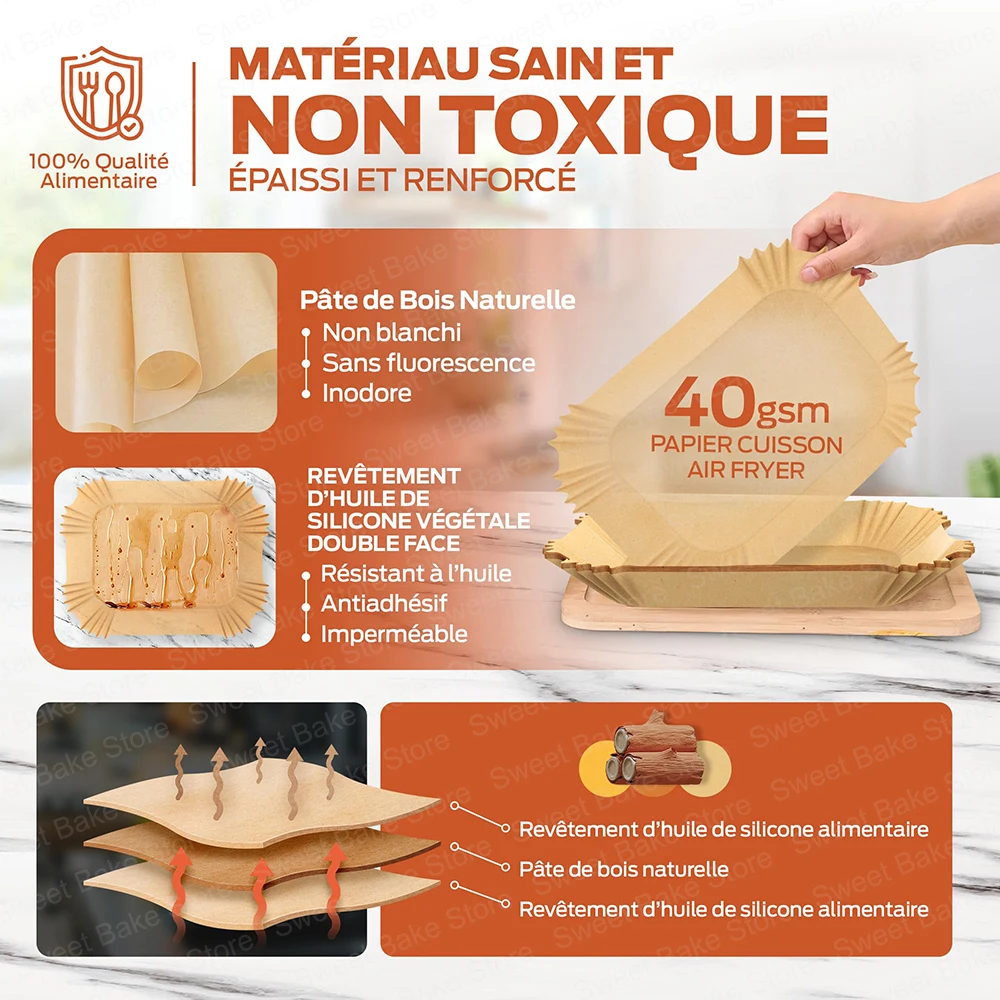 Les feuilles de cuisson rectangulaires sont fabriquées en papier sulfurisé non blanchi avec un double revêtement en silicone. Sans agents fluorescents, sans BPA, elles n’altèrent ni le goût des aliments ni la circulation de l’air chaud pendant la cuisson.