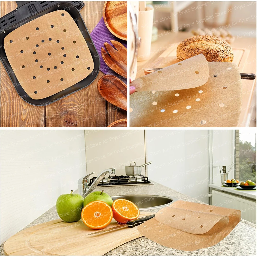 🍟 EXTRA ROBUSTE – Ces feuilles de cuisson carrées pour airfryer sont fabriquées en papier 45 gsm haute résistance, plus épais et plus ferme que le papier classique de 35 ou 40 gsm.