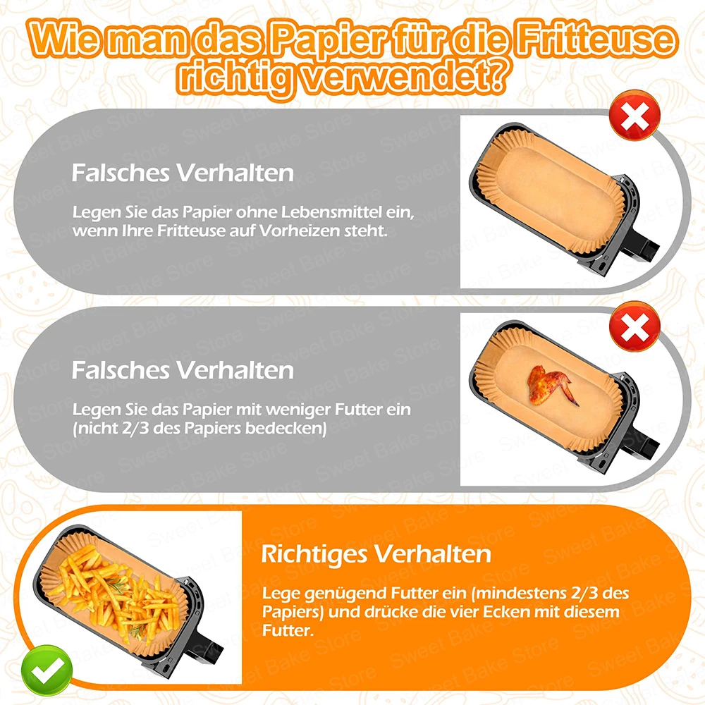 🍃 Papier cuisson premium – Fabriqué à partir de pâte 100 % alimentaire, sans substances fluorescentes, avec un revêtement antiadhésif des deux côtés. Épais, durable, résistant à l’eau et à l’huile, il protège vos aliments et votre airfryer.