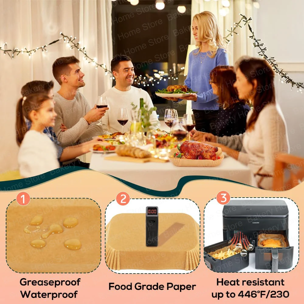 Supportent jusqu’à 232 °C (450 °F), utilisables au four et au micro-ondes. Prêtes à l’emploi avec leur forme en bol, pas besoin de découper ni plier : placez-les simplement dans le panier, puis jetez-les après utilisation. Plus pratiques que les liners en silicone.